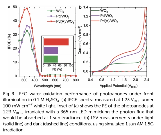 ? 測量內(nèi)容:Pd(A)/WO?在1.23 VRHE下光電流達(dá)0.28 mA·cm?2,較WO3(0.16 mA·cm?2)提升75%;IPCE譜顯示響應(yīng)區(qū)間300-450 nm。