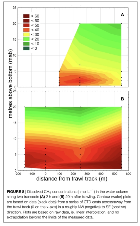 研究通過實地實驗量化了小型拖網在波羅的海泥質海底單次作業的物理擾動和生物地球化學影響。多波束測深顯示拖網形成36米寬的軌跡(含平行溝槽和沉積物堆積),每公里軌跡位移500噸沉積物并懸浮9.5噸沉積物。拖網門對沉積物的單位面積擾動強度是其他漁具的5倍(位移)和2倍(懸浮)。懸浮沉積物擴散至1公里外,形成5-10米厚的渾濁底層水體。拖網后2小時,距軌跡550米處濁度達4.3 NTU(7 mgDW/L),溶解態氮、磷、錳在底層水體中脈沖式釋放,溶解甲烷濃度持續升高20小時以上。拖網軌跡區沉積物生物地球化學在48小時后仍受擾動,表現為氧滲透深度減小及沉積物-水界面營養鹽/氧通量改變。