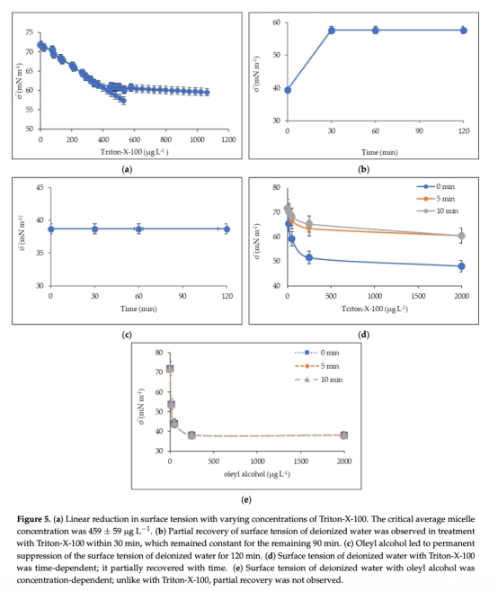 4. 人工表面活性劑實驗:添加Triton-X-100和油醇(濃度13–2000μg L?1),評估其對DBL和表面張力的動態影響(圖3,5)。