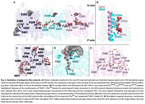 數據來源:冷凍電鏡結構(2.1 ?)顯示膜臂亞基(ND2、ND4、ND5)中的 99個水分子(紅色球體)。