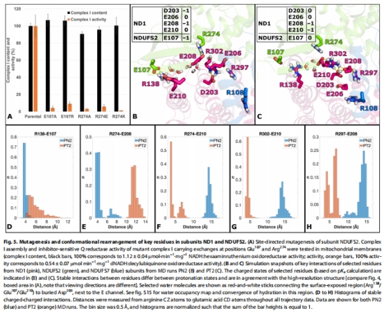 質子泵機制:結合分子動力學模擬(MD)和點突變實驗,提出 醌(Q)還原驅動的質子傳遞模型(圖6),其中ND1亞基的構象變化調控質子傳遞至中央親水軸。