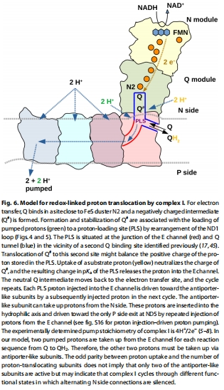 醌還原釋放能量 → 質子加載位點(PLS)充電 → 質子注入E通道 → 驅動膜臂質子傳遞。