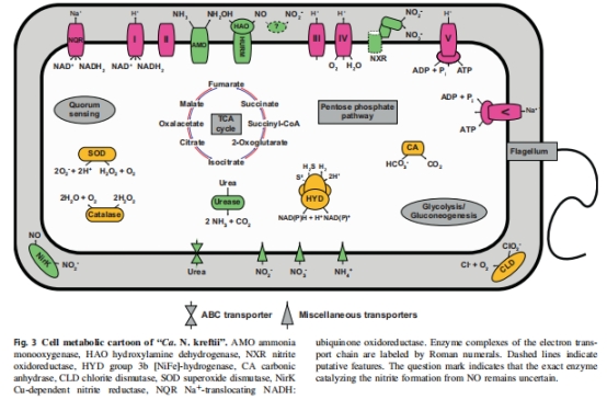 雙高親和力:其氨(0.04 μM)和亞硝酸鹽(12.5 μM)親和力均優(yōu)于多數(shù)AOB/AOA(圖8),適應(yīng)極端貧營養(yǎng)環(huán)境。