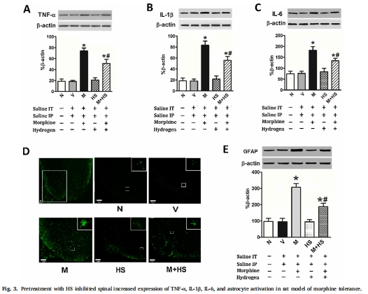 Hydrogen enriched saline alleviates morphine tolerance via inhibiting neuroinflammation, GLT-1, GS nitration and NMDA receptor trafficking and functioning in the spinal cord of rats