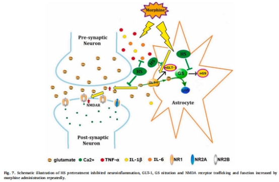 核心結(jié)論:HS通過(guò)抑制神經(jīng)炎癥、GLT-1/GS硝化、NMDA受體功能異常,維持谷氨酸穩(wěn)態(tài),從而緩解嗎啡耐受(圖7)。
