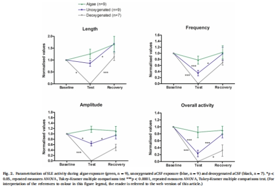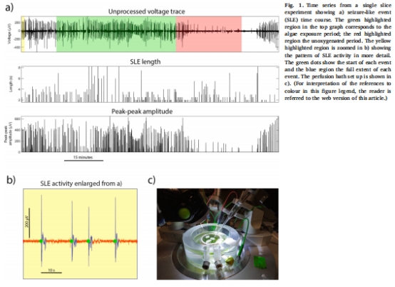 微藻供氧組皮層切片的癲癇樣事件(SLE)活動(頻率、振幅、時長)與常規氧合組無差異(圖1, 圖2);