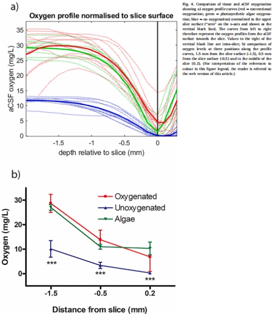 首次繪制腦切片內氧空間梯度,證實光合供氧在深部組織的有效性(中部氧濃度10.3 mg/L)。