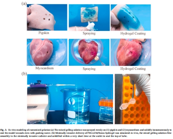 體外模型:噴涂快速凝膠封閉豬心肌出血(圖3a),導(dǎo)管內(nèi)定制凝膠時間匹配流動(圖3b);