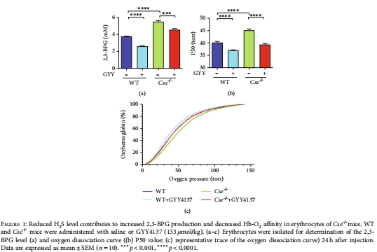H?S缺失導致2,3-BPG升高:胱硫醚-γ-裂解酶(CSE)基因敲除(Cse?/?)小鼠紅細胞中2,3-BPG水平顯著增加,50%氧飽和度(P50)值升高(圖1a-c)。