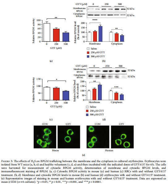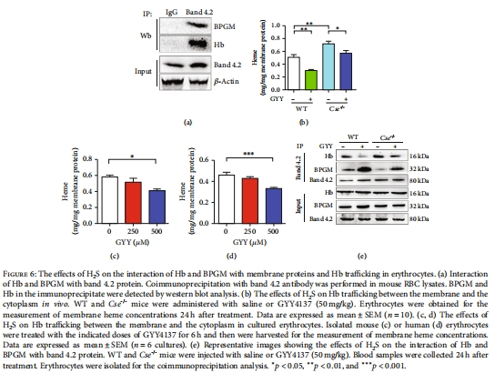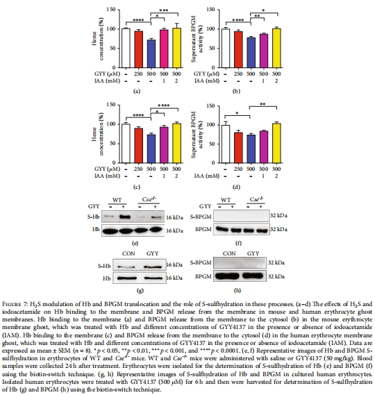 分子機制:H?S通過促進Hb從膜釋放至胞質,增強BPGM膜錨定(圖4-6),該過程與Hb的S-硫磺化修飾(Cys104位點)相關(圖7)。