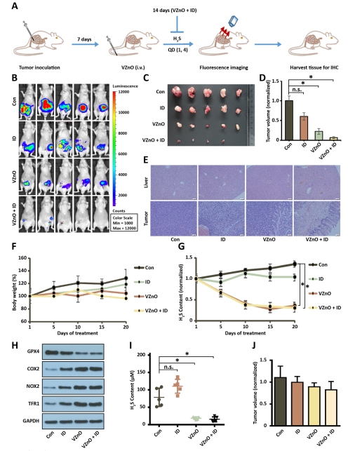 動(dòng)態(tài)監(jiān)測(cè)VZnO治療后腫瘤H?S持續(xù)下降(圖5G),直接關(guān)聯(lián)療效與H?S清除效率。