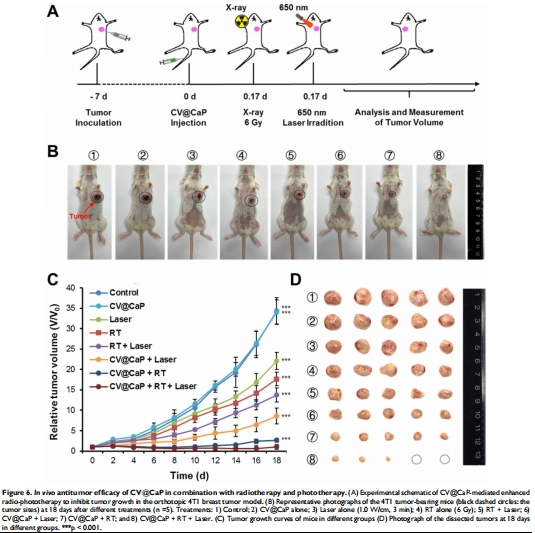 協(xié)同治療:放療(6Gy X射線)+光療(650nm激光)抑制原發(fā)灶及轉移(圖6-8)。