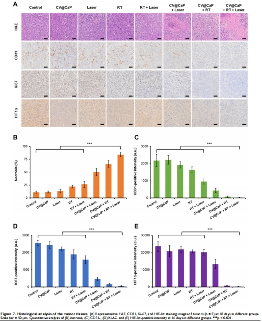 肺/肝轉移抑制:CV@CaP+RT+Laser組無可見轉移灶(圖8A-B)→ 意義:系統(tǒng)治療抑制遠端轉移。