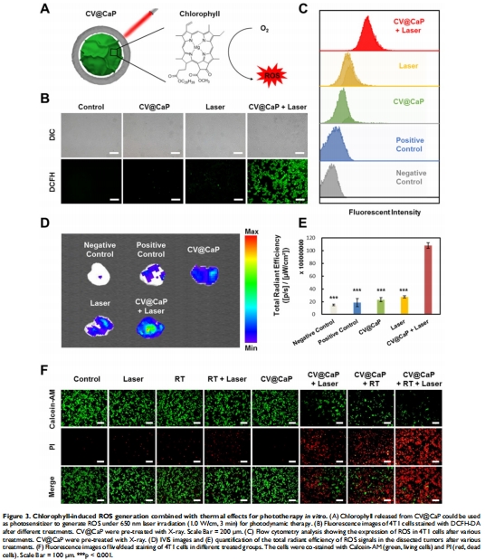 ROS生成:DCFH-DA檢測顯示CV@CaP+激光組ROS↑93.2%(圖3B-C)→ 意義:級聯光動力治療可行性驗證。