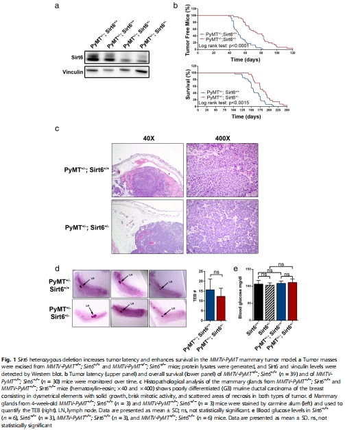 動物模型:Sirt6雜合缺失(Sirt6?/?)顯著延長MMTV-PyMT小鼠乳腺腫瘤潛伏期并提高生存率(圖1b);