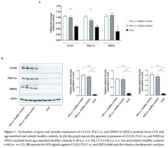CLUH, PGC1-α, SIRT6 基因和蛋白表達在CCS中顯著下調(圖7A-B),而健康老年人無此現(xiàn)象。
