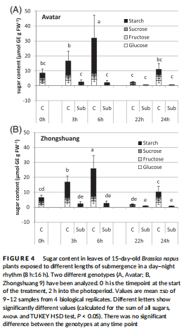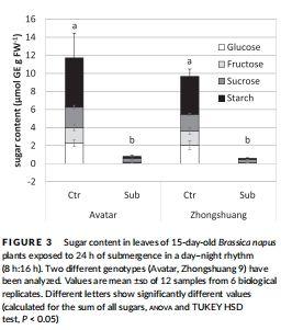 淹水3小時內糖含量顯著下降(圖4),24小時后降至對照10%以下(圖3)。