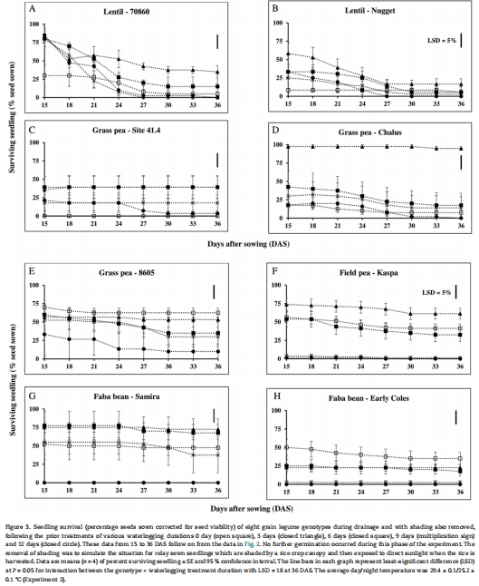 本研究評估了草豌豆(3基因型)、小扁豆(2基因型)、蠶豆(2基因型)和豌豆(1基因型)在萌發期對澇漬、低氧(1.0/2.5 kPa氧分壓)和無氧(氮氣環境)的耐受性差異: