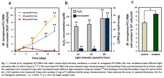 數(shù)據(jù):高光照(80 μmol m?2 s?1)導(dǎo)致無菌藻死亡(細(xì)胞計(jì)數(shù)下降),伴隨H?O?積累(0.8 μM)和微囊藻毒素釋放(14倍增加)(圖1b)。