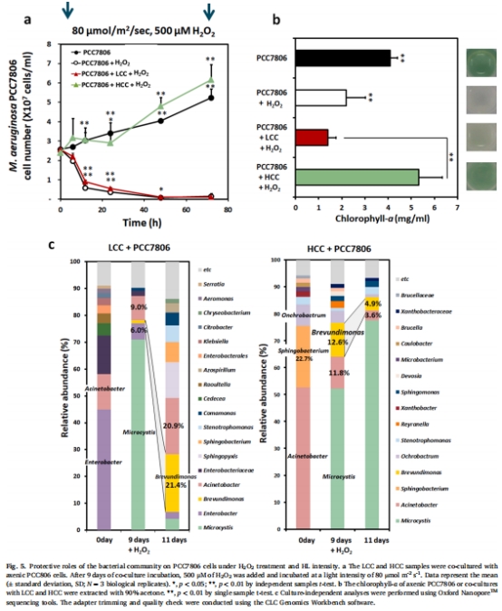 高光照(80 μmol m?2 s?1)誘導(dǎo)銅綠微囊藻產(chǎn)生過量H?O?,導(dǎo)致無菌藻細(xì)胞死亡(圖1a),而共生高過氧化氫酶活性細(xì)菌群落(HCC)可促進(jìn)藻生長(圖5a)。