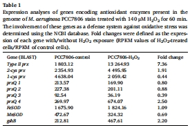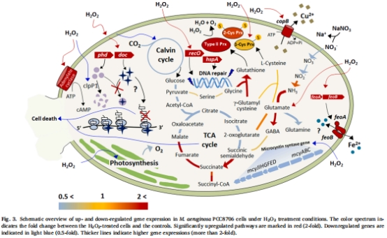 轉(zhuǎn)錄組分析顯示,H?O?脅迫下藻細(xì)胞上調(diào)抗氧化基因(如Ⅱ型過氧化物還原酶prx,7.36倍)和毒素-抗毒素系統(tǒng)(如doc基因30倍上調(diào)),但下調(diào)光合作用基因(如cpcA下調(diào)92%)(表1,圖3)。