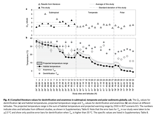 3. 低緯度沉積物中,近期夏季溫度已超過厭氧氨氧化T???,未來變暖可能抑制該過程,進一步放大反硝化主導的N?O排放,形成正氣候反饋。