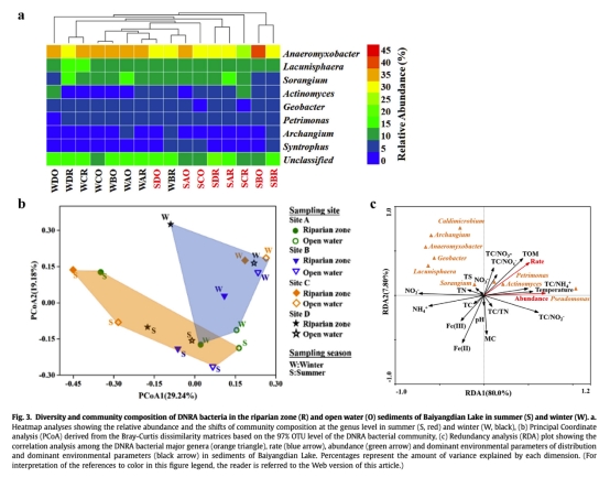 ? 數據:河岸帶DNRA速率(35.28±5.56 nmol N g?1 h?1)為開闊水域的2倍,夏季速率高于冬季。