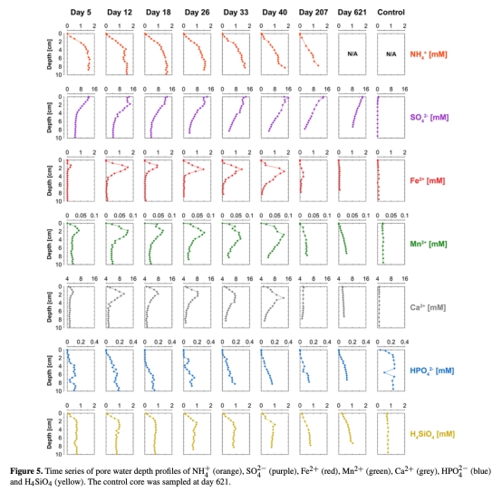 ? 地球化學(xué)響應(yīng):微電極剖面(O?、H?S、pH)、孔隙水離子(Fe2?、Mn2?、Ca2?、HPO?2?)、固相分餾(Fe氧化物、FeS、菱鐵礦)(Fig. 5, 7)。