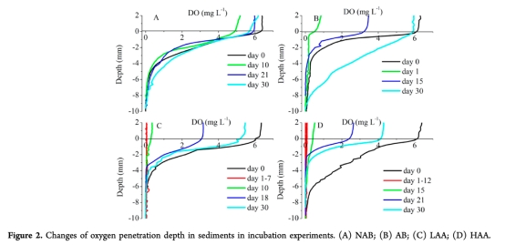 ? 意義:量化藻類分解耗氧強度——HAA處理24小時內(nèi)氧滲透深度降至0 mm并持續(xù)15天(圖2D),證明重度藻聚集引發(fā)長期缺氧。