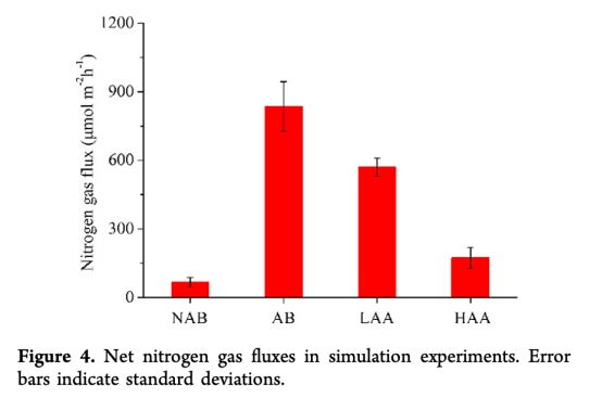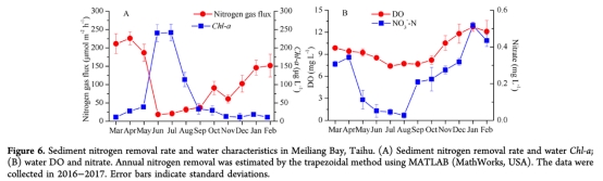 ? 意義:實驗顯示HAA處理氮去除率比AB處理降低79%(173.9 vs 835.6 μmol N m?2 h?1);現(xiàn)場數(shù)據(jù)證實藻聚集期(6-8月)氮去除率降至<10 μmol N m?2 h?1(圖6A)。
