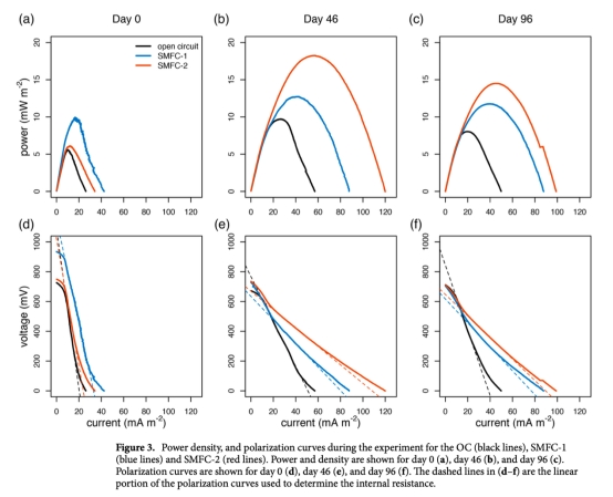 2. 持續監測96天,記錄電壓、電流和功率密度(圖2、圖3)