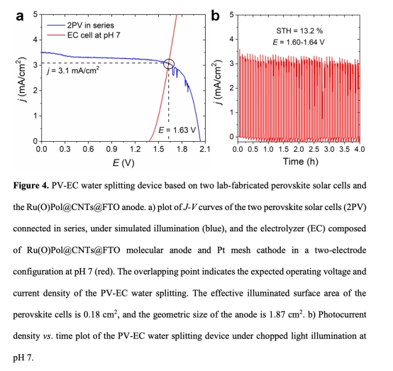 ? 數據:鈣鈦礦-PV-EC系統3 mA/cm2穩定電流(4小時);三結電池系統6 mA/cm2(15小時)