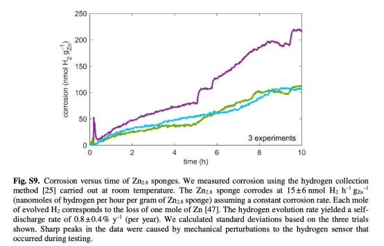 3. 長期穩定性驗證:數據證實鋅海綿電極腐蝕速率僅為商用電池的1/4,歸因于低比表面積(2.83 g cm?3密度 vs 粉末電極)