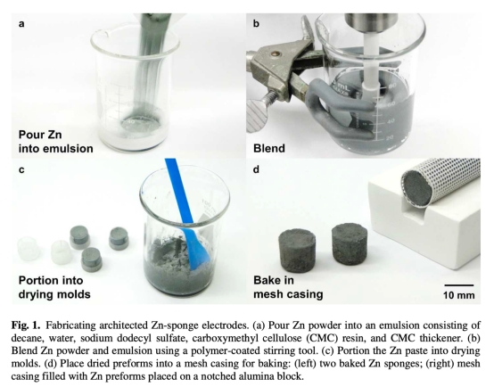摘要報道了一種通過改進鋅海綿電極(Zn-sponge)制備工藝實現體積容量(928 mAh cm?3)和機械強度(1 MPa)突破的新方法。該電極采用雙類型羧甲基纖維素(CMC)乳液配方、網狀模具熱成型技術及優化熱處理工藝(圖1),在避免傳統添加劑降低容量的前提下,使Zn2.8高密度電極(2.83 g cm?3)在鎳鋅電池中循環115次后仍保持100%庫侖效率。自放電率僅0.8%/年,可擴展至10×10 cm實用尺寸。