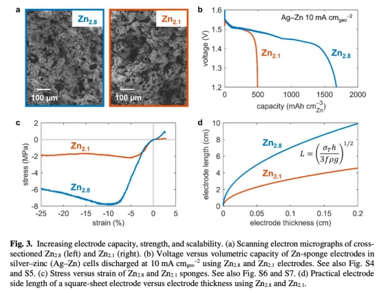 3. 性能驗證:對比Zn2.1(2.11 g cm?3)與Zn2.8電極,系統測試機械強度、電化學性能和可擴展性