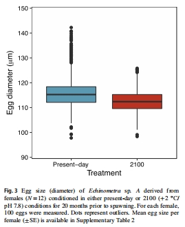 將成體海膽(Echinometrasp. A)置于模擬環境(當代:26°C/pH 8.1 vs. 2100年:28°C/pH 7.8)20個月(覆蓋兩個繁殖周期)。