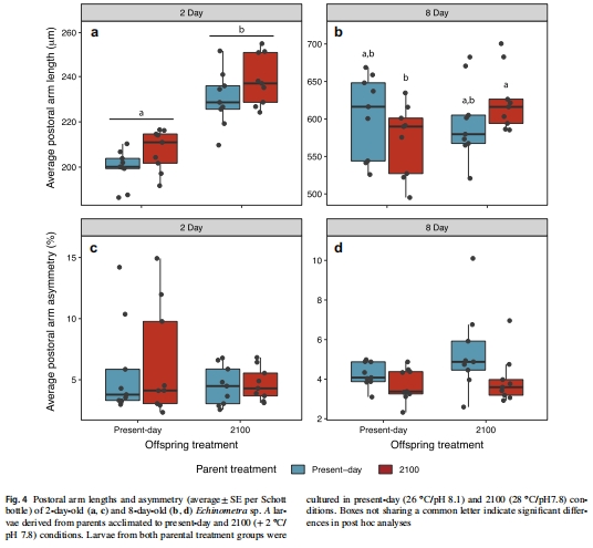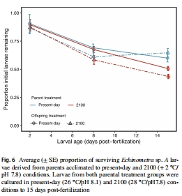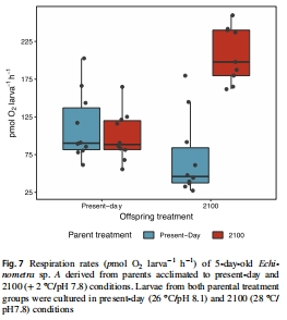 關鍵結論:父母長期(20個月)暴露于2100年預測海洋條件(升溫+2°C/酸化pH 7.8)雖加速后代幼蟲早期發育速率(體型更大、發育階段更早),但顯著降低存活率(15天時存活率僅43.7-50.6%),且呼吸代謝數據表明能量消耗模式異常。負面跨代效應(減少生存)超過發育增益。