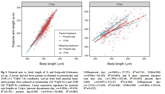 2100父母后代在2100條件下身體比例更大,表明發育加速(如8天斜率0.885 vs. 當代組1.299)。