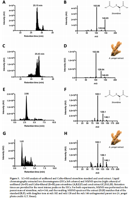 LC-MS/MS確認海藻氨酸為終產物(m/z 146→128/102離子對)(圖3B,D,F,H);