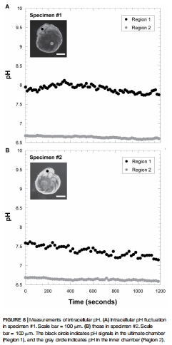 3. 盜質(zhì)體光合作用產(chǎn)生氧氣(背側(cè)產(chǎn)氧率35.7 nmol O? hr?1 cm?2,圖6A),同時(shí)維持高細(xì)胞內(nèi)pH(7.33-7.90,圖8),促進(jìn)高鎂方解石殼體形成;