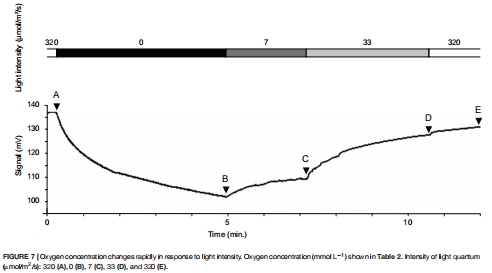 光照強(qiáng)度從320→0 μmol光子時(shí),5分鐘內(nèi)氧濃度從350→259 μmol/L(圖7);