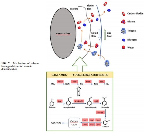 首次證實(shí)好氧條件下甲苯氧化與硝酸鹽還原的耦合機(jī)制(圖7),氧氣與硝酸鹽可同時(shí)作為電子受體。