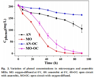 微氧條件(DO=282±20 μmol/L)下,+0.4 V電極電位使苯酚降解速率提升59%,降解時間縮短至66小時(圖3);