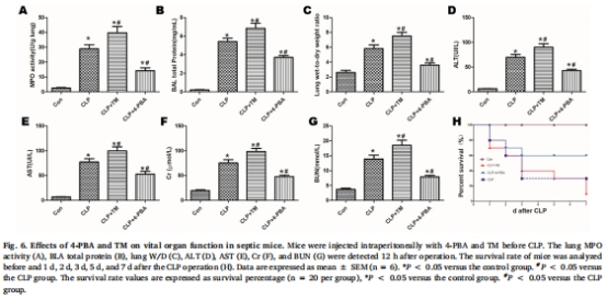 器官損傷:肺(MPO活性/W/D比)、肝(ALT/AST)、腎(Cr/BUN)(圖6,10)。