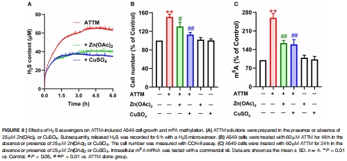 鋅劑逆轉(zhuǎn)效應(yīng):Zn(OAc)? 持續(xù)清除 H?S(6 小時(shí)監(jiān)測(cè),圖 8A),阻斷 ATTM 的促增殖(圖 8B)、促 m6A 甲基化(圖 8C)作用。