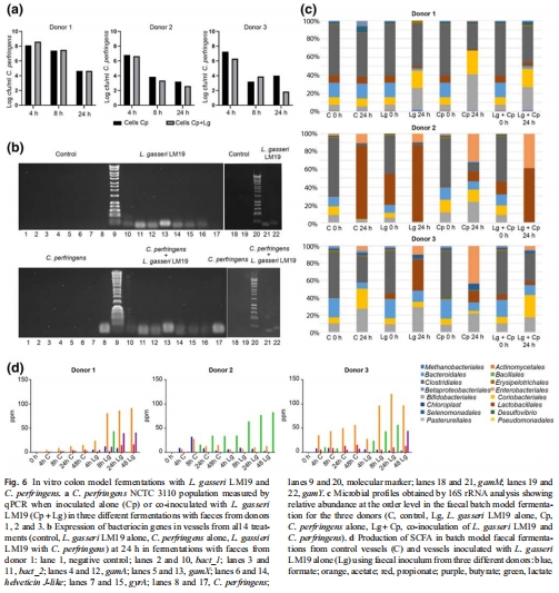 在模擬結腸環境中接種LM19,監測其存活、細菌素基因表達(RT-qPCR,圖6b)、SCFA產生(NMR,圖6d)及微生物群變化(16S rRNA測序,圖6c)。