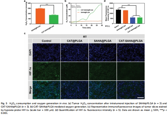 關鍵數據:注射CAT-SAHA@PLGA后,氧濃度在25分鐘內從基線升至55 μM(圖5b)。