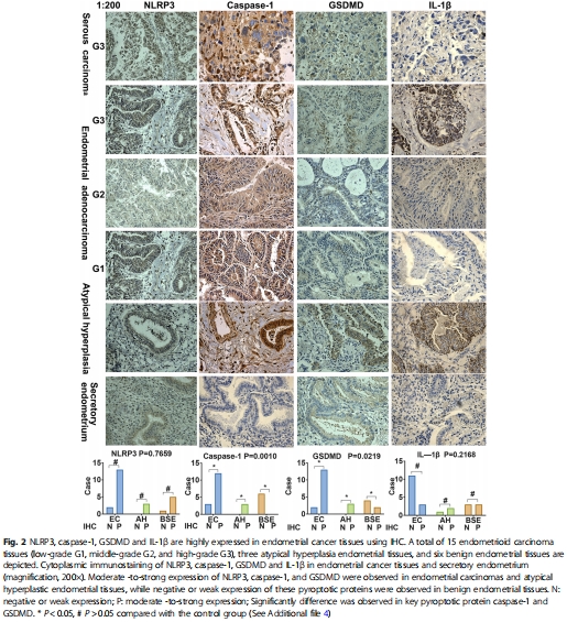 免疫組化(IHC)檢測人子宮內(nèi)膜癌組織中NLRP3、caspase-1、GSDMD表達(dá)(圖2)。