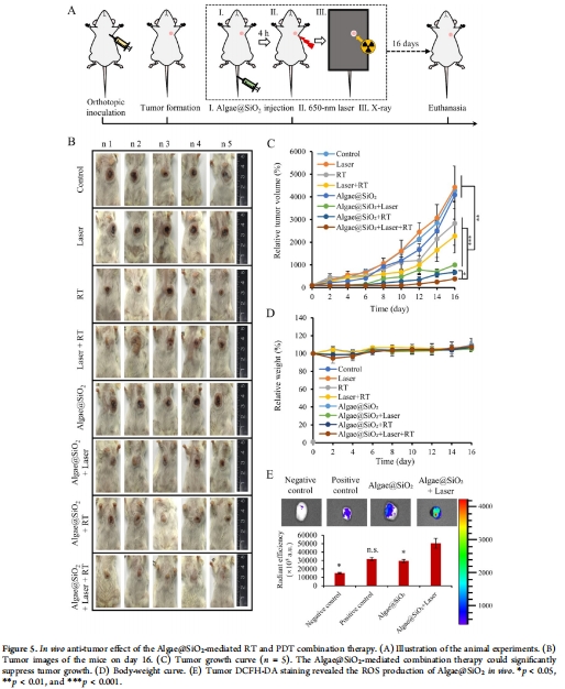 2.治療機制:Algae@SiO?通過光合產氧增敏放療,并利用葉綠素實現PDT,形成協同抗腫瘤效應。