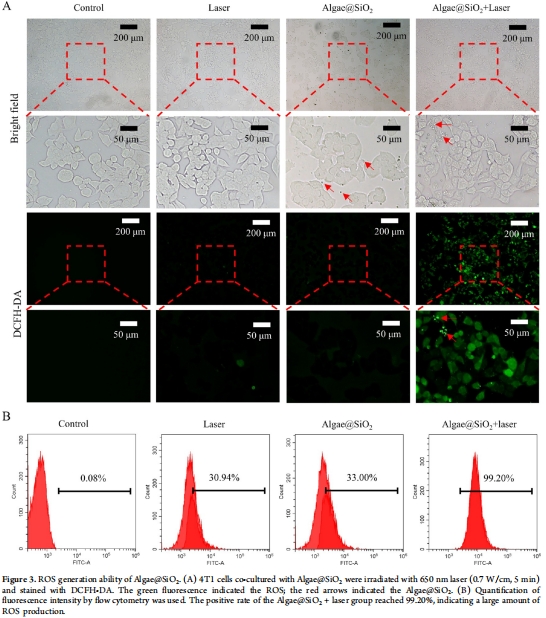 DCFH-DA染色:Algae@SiO?+激光組ROS陽性率99.2%(圖3B),體內腫瘤ROS顯著升高(圖5E)。